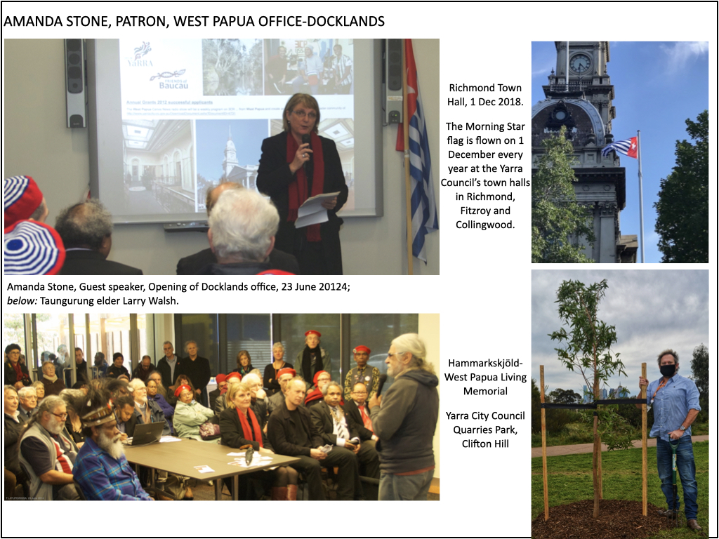 AMANDA STONE, who is launching Jacob and the Cassowary, was a Yarra City Councillor for sixteen years, is the Executive Officer of Yarra Drug and Health Forum, and has been the Patron of the West Papua Office in Docklands since 2014. As a councillor Amanda organised a formal welcome for the 43 West Papuan asylum seekers who beached their traditional canoe in Mapoon in Far North Queensland in 2006. She also legislated for the Morning Star flag to be raised every year on 1 December at the Council’s town halls in Richmond, Colllingwood, and Fitzroy. In 2014 she was a keynote speaker at the opening of the West Papua office in Docklands, and in 2020 organised the Hammarkskjöld-West Papua Living Memorial in Quarries Park, Clifton Hill.