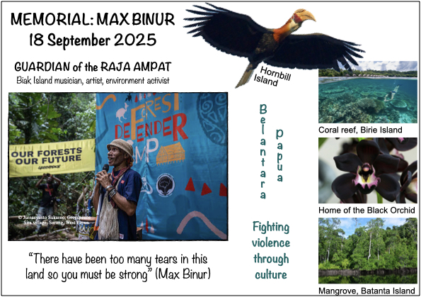 Bright-eyed, big spirited Max Binur died in Sorong on 18 September 2025. Max was an artist, musician and environmental activist who alerted Papuan communities in the Raja Ampat archipelago to the ravages of nickel mining. As he travelled from village to village he taught Papuan youth how to apply ancient tribal principles of sustainability to defend and protect their forest and marine environments from the mining barons, especially those claiming to be philanthropists. He didn’t excluding the Indonesian settlers and transmigrants, but rather fostered their empathy for the injustices West Papuans experience.