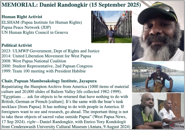 With the death of anthropologist Daniel Randongkir West Papuans have lost another courageous activist. In 1999 Daniel was the student representative on TEAM 100 that travelled to Jakarta to meet President Habibie and [diplomatically] demanded West Papua’s independence. He then spent years working with the Papua Peace Network, and with EL-SHAM, the Papuan human rights organisation, and has testified before the UN Human Rights Council in Geneva. Daniel also spent much of his adult life helping to develop his nation’s independent political structure, and at the time of his death was Head of the Rights and Justice Department in the ULMWP Government.