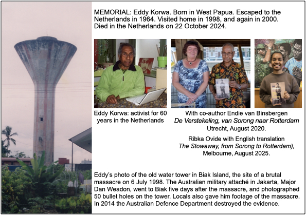 Endie van Binsbergen is a respected Dutch activist with years of experience in Lombok (Indonesia) and East Timor, and with the peoples of the former Dutch East Indies forced to live in exile in The Netherlands, including Moluccans and West Papuans. She is the co-author of Eddy Korwa’s memoir De Verstekeling, van Sorong naar Rotterdam that was published in 2020 by Stichting Vrij Oost Timor/Free East Timor Foundation in The Netherlands; and instrumental in the English translation The Stowaway, from Sorong to Rotterdam published in 2025 by Stichting Vrij Oost Timor/Free East Timor Foundation (NL) and West Papua Office-Docklands. More on Endie, and The Stowaway, from Sorong to Rotterdam at https://dfait.federalrepublicofwestpapua.net/document/wp-open-day-31-aug-2025-launching-the-stowaway/