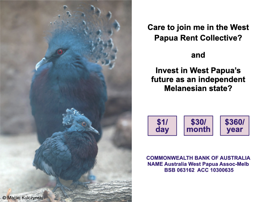 The West Papua Rent Collective is a luminous galaxy of Australians who have been investing in West Papua’s future as an independent Melanesian state since 2014. Members donation of $1 a day ($30/month, $360/year) pays the rent on the Federal Republic of West Papua’s five 5-star energy office at 838 Collins Street in Docklands (Melbourne). The Office, co-ordinated by Jacob Rumbiak (Foreign Affairs Minister, West Papua Transitional Government) works within the parameters of Self-determination, Sustainability and Good Governance.