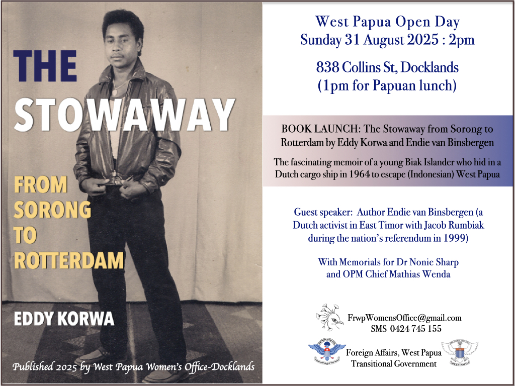 On 31 August 2025, the West Papua Women’s Office-Docklands published its English translation of Eddy Korwa’s De Verstekeling, van Sorong naar Rotterdam (The Stowaway, from Sorong to Rotterdam). Eddy was a protegee of the political and social development in West Papua between 1950 and 1962 when his homeland was a United Nations Non-Self-Governing Territory (NSGT) administered by the Netherlands. As a NSGT West Papua should have been decolonised in accord with international law, but after the murder of UN Secretary-General Dag Hammarskjöld in 1961, the United Nations voted to transfer the administration to Indonesia. A NSGT can only change its status via an exercise of self-determination (referendum) wherein the people choose to i) become an independent state, or ii) in free association with another state, or iii) integrate with an independent state. There has never been an act of self-determination in West Papua.